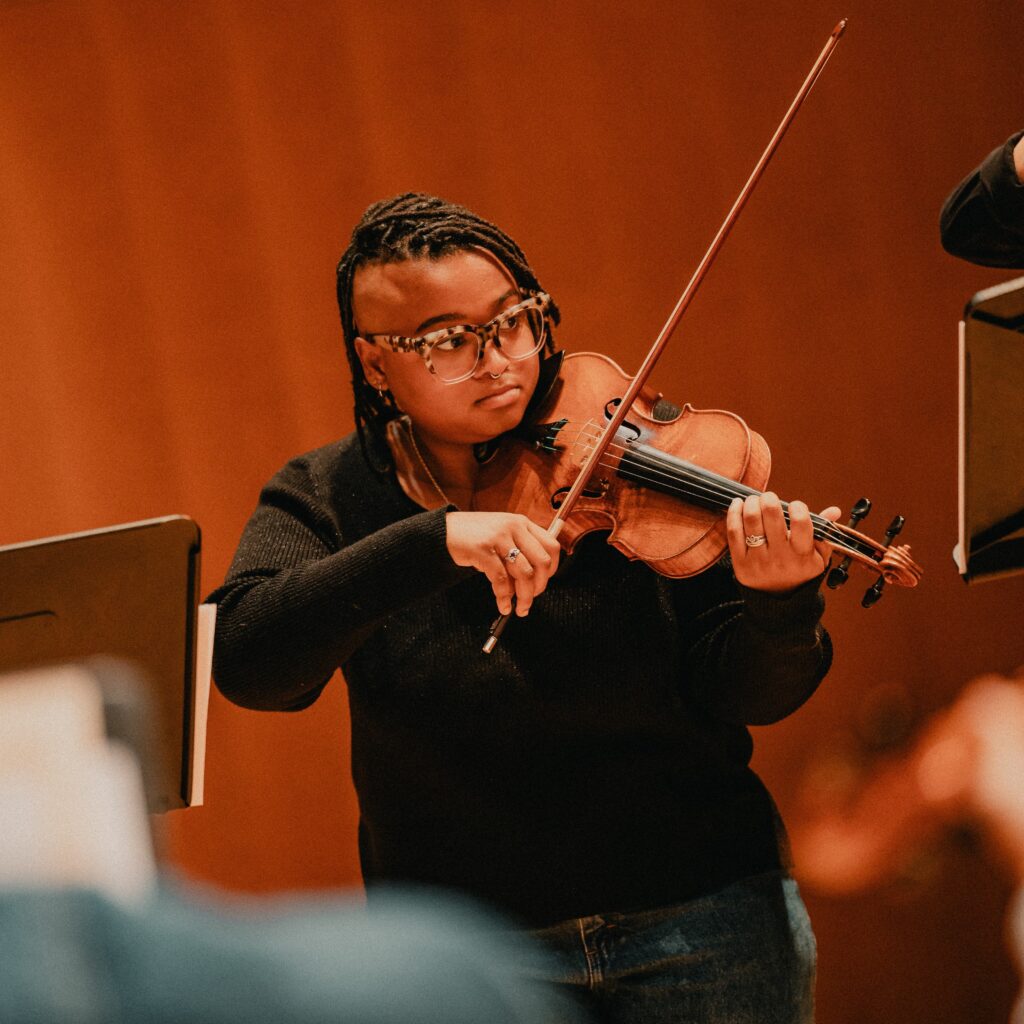 Nema Robinson, BM/MA ’27 (Music Education), University of Maryland Baltimore County. Violinist, University of Maryland Baltimore County Chamber Orchestra; Violin Teaching Artist, Baltimore Symphony OrchKids Program; Faculty, John Hopkins Peabody Preparatory; Faculty, Tuned In at The Peabody Institute; Violin Teacher, Bridges Baltimore; Alumni Leader, El Sistema USA; National Association of Music Education, Executive Board Member; Violinist, University of Maryland Baltimore County Symphony Orchestra (2021-2024). Photo credit: Kiirstn Pagan Creative Services