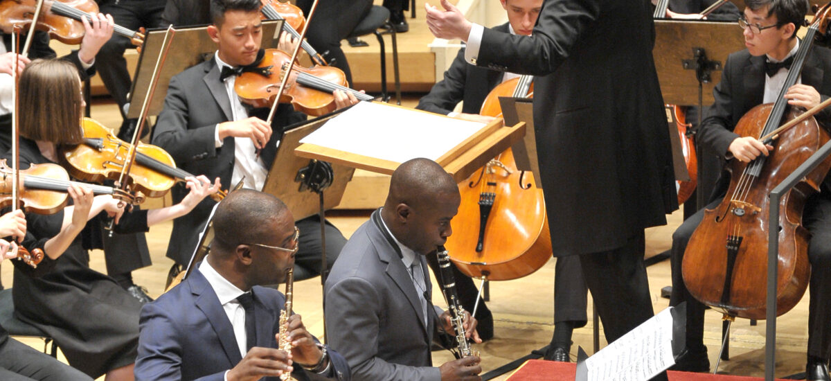 Banner: League of American Orchestras, 2018 National Conference in Chicago, world premiere of a double concerto by Michael Abels, composer of the score to the film, Get Out, performed by Anthony McGill and Demarre McGill with the Chicago Youth Symphony Orchestras, conducted by Allen Tinkham, CYSO Music Director. Photo: Dan Rest